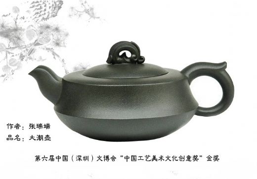 张瑞端,出生于陶艺世家,高级工艺美术师,中国工艺美术协会理事,广东省工艺美术协会副会长。广东省工艺美术研究所——紫砂艺术中心主任,研究员,荆瀛轩艺术总监。其作品多次荣获国家级和省级大展金奖﹑多件作品被“中国工艺美术馆”收藏。 张瑞端的作品中,有一股潮州文化的韵味,其实是他骨子里的东西,他的作品很多壶语都来自潮州的山水、潮州的物产、潮州的文化和潮州人尊师重教的精神。 2010年创作的《大潮》紫砂壶其作品以创意独特,造型简练,寓意深远。整个壶壶身从曼生十八式“井栏”壶化出,墩庞周正,用简单的几条弧线烘托壶钮的塑造,壶钮以浪潮的抽象化表现手法,造型中三条曲线重叠,三条曲线象征着贯穿于潮汕平原的韩江、榕江、练江三江在南海汇合,奔流入海,更寄寓海内外潮人团结一致,为家乡的经济腾飞奋斗拼搏的精神,充分展现了改革开放的时代脉搏,是一件主题鲜明,不落俗套的工艺美术作品。 从《大潮》这件作品可以发现张瑞端活跃的思维、丰富的想象力、巧妙的构思和出人意表的创造力。造型不陈陈相因,承接传统文脉 彰显时代精神,用抽象的形式,表现了一个时代性鲜明的社会主题——它旨在表现生长在韩江、练江、榕江三江汇聚之地的潮汕人,正激情澎湃地迎接挑战的进取精神和海纳百川的博大气度。整体简洁、明快,面目一新。 |