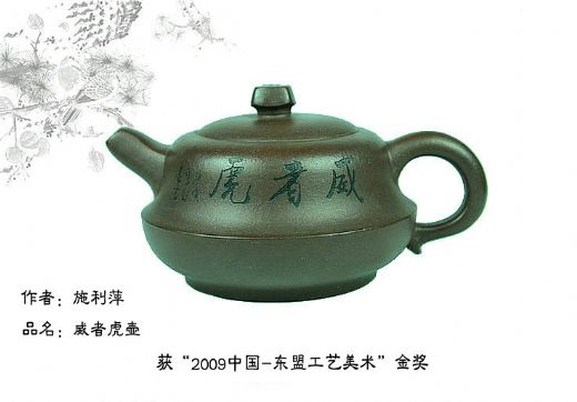 虎文化是中国文化传统的一个重要组成部分,虎亦一直被当做权利和力量的象征.细观此《威者壶》壶,以传统圆形为基调,塑造端正,方圆相配, 墩庞周正,以此壶名为威者虎,正切其王者之风.作者为了呼应虎的意向,特意在壶的方钮上刻一「王」字,在壶身刻以四象中「西白虎」图案,把《威者虎》这一命题发挥的淋漓尽致.